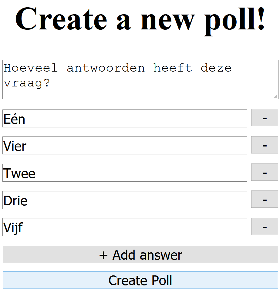 Als de gebruiker op "Create Poll" drukt wordt de nieuwe poll weggeschreven via de PollAPI klasse, worden alle input velden terug leeg gemaakt en worden er terug drie (lege) antwoorden getoond.