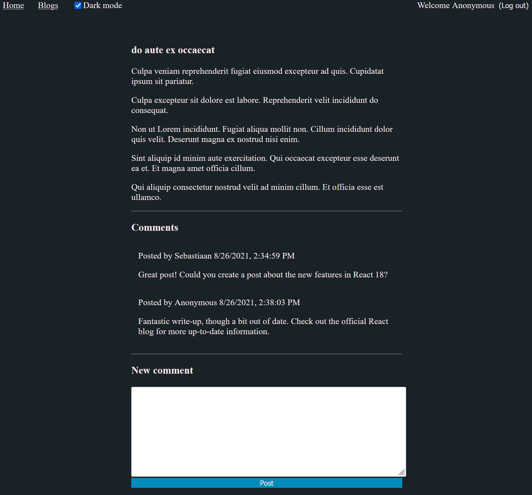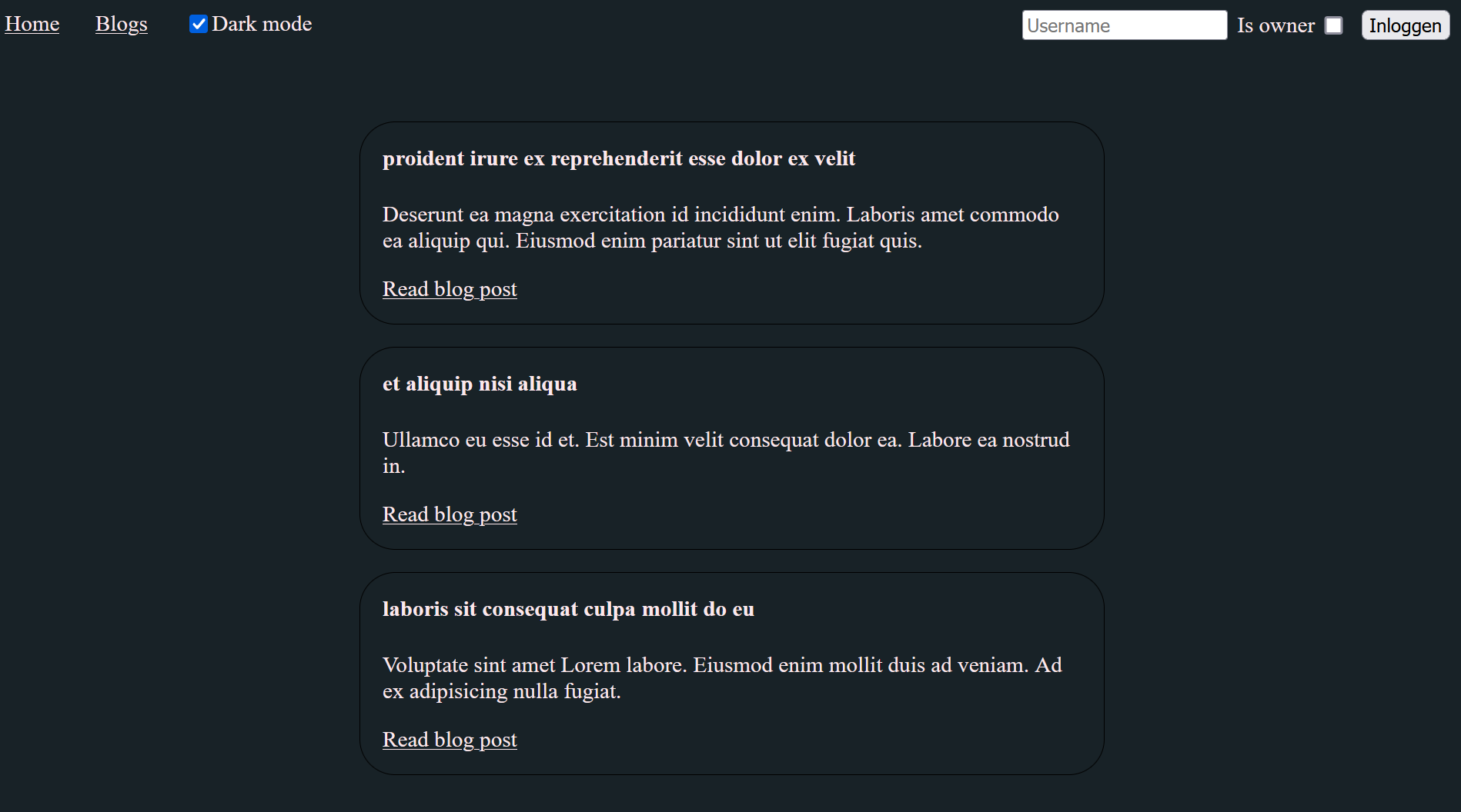 Deze component kan zowel gebruikt worden om de reeds bestaande blogposts te bekijken als om een nieuwe post aan te maken. Het is natuurlijk vanzelfsprekend dat een nieuwe post enkel aangemaakt kan worden door de eigenaar van de blog (zie LoginForm). De eigenaar ziet een knop "New blog post" als hij het pad "/blogs" bekijkt. De createNewBlog methode uit de BlogsAPI klasse genereert een blogpost bestaande uit lorem-ipsum tekst.