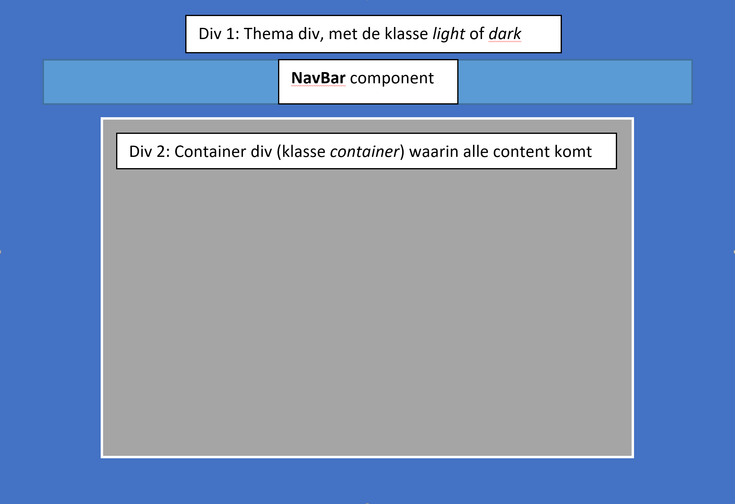 De HomePage component bestaat uit een div die ofwel de klasse dark of de klasse light krijgt. De lezer van de blog kan via een checkbox in de NavBar component (zie verder) het thema van de website aanpassen van light naar dark en omgekeerd. Binnen deze div wordt eerst de NavBar component geplaatst, verder bevat de HomePage ook een andere div die de klasse container krijgt.