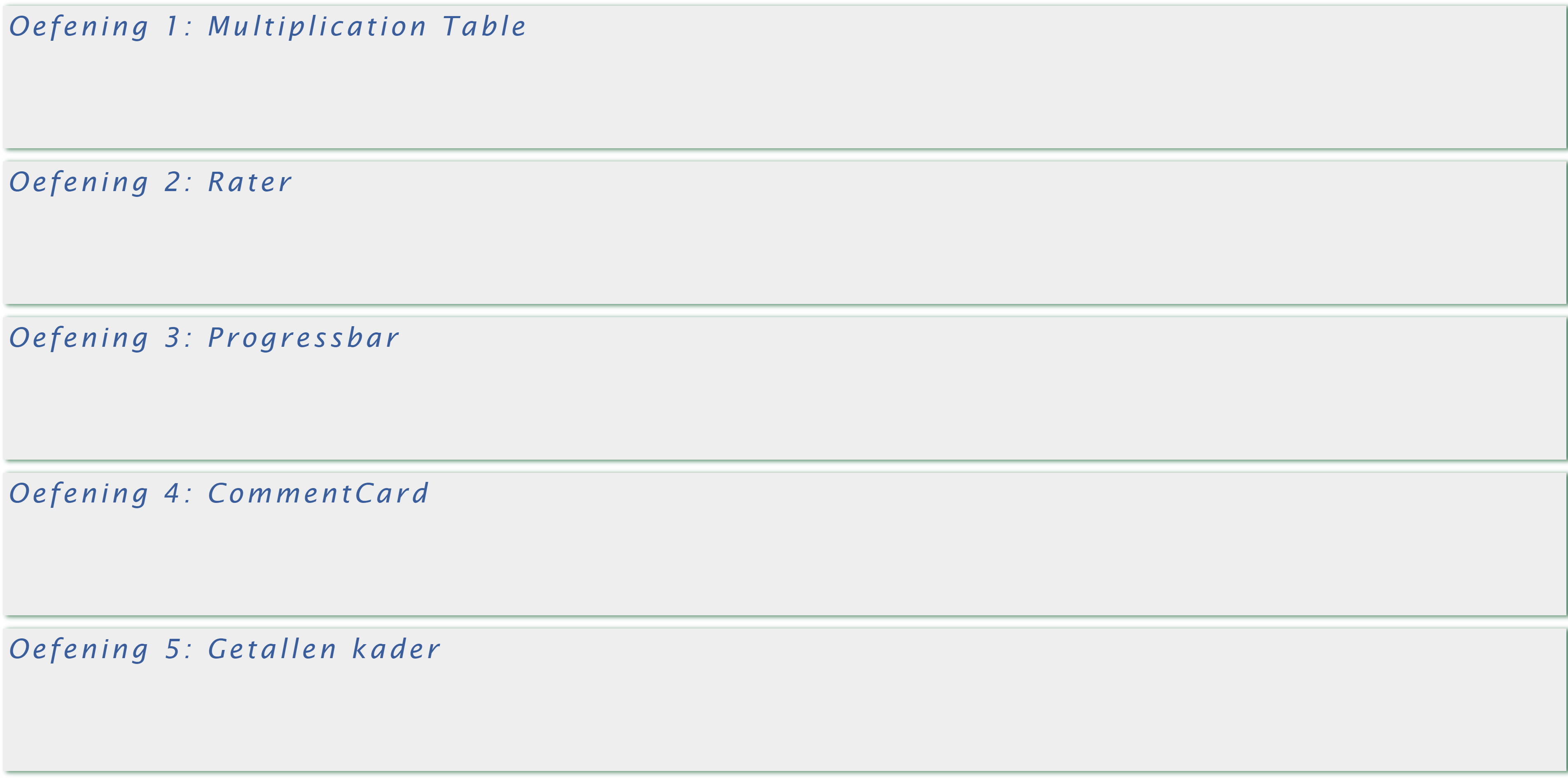 Bouw een component Exercise. Deze component bevat een div die, vanuit de JavaScript code, volgende opmaakt krijgt.