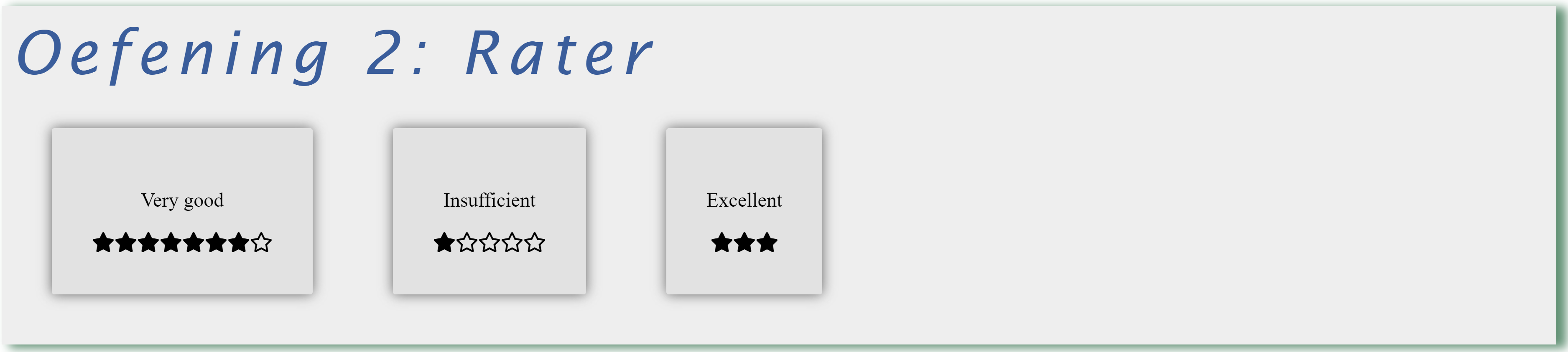 Maak een nieuw bestand rater.js en bouw hierin een component ExerciseTwo die geëxporteerd wordt zodat je deze op de homepage van je website kan gebruiken om onderstaand resultaat te bouwen.