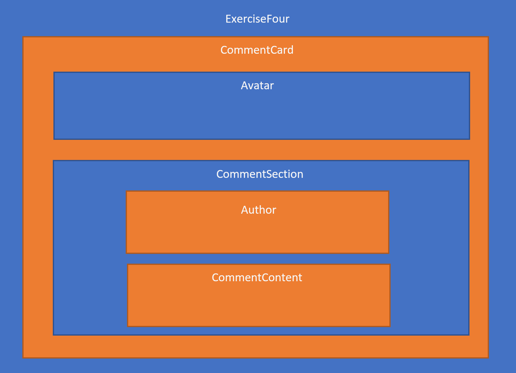 Maak een nieuw bestand comment-card.js aan en definieer hierin een component ExerciseFour. Bekijk vervolgens onderstaande structuur (elke kader duid een component aan) en bouw deze na.