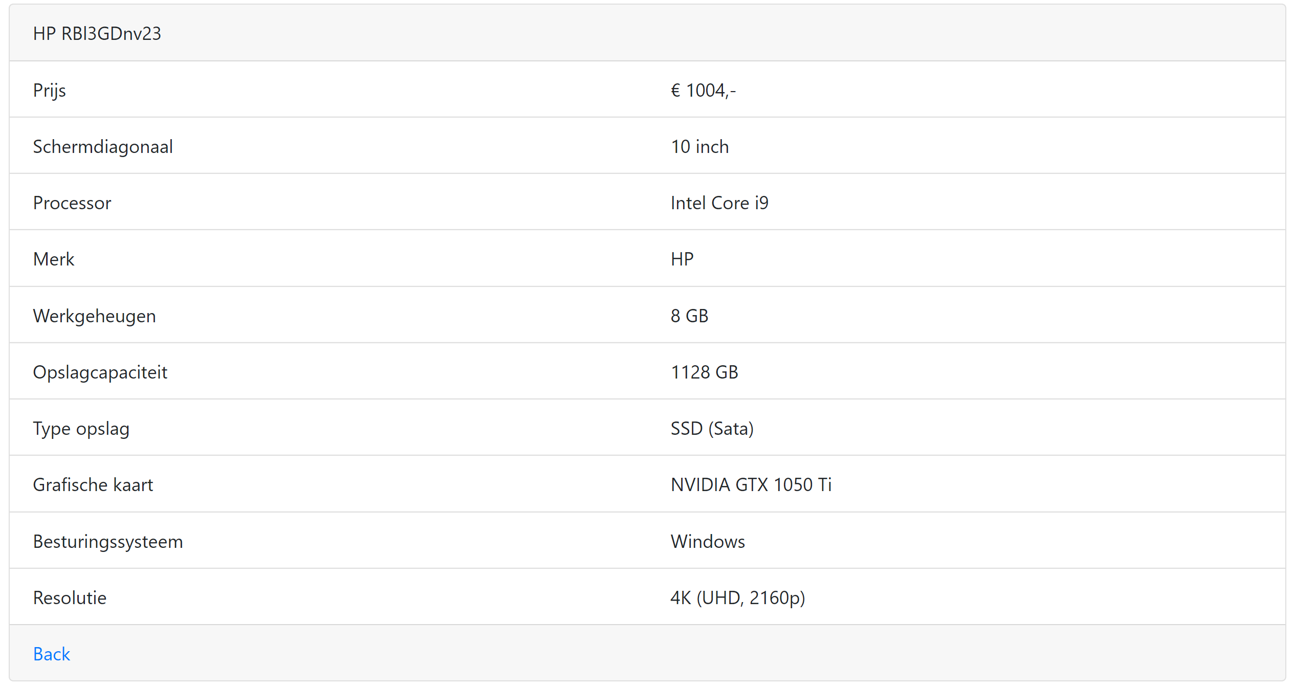 Maak een detailpagina aan voor een laptop. Deze pagina is gebouwd met behulp van een Bootstrap Card en gebruikt het Bootstrap grid om twee aparte lijsten naast elkaar weer te geven. De marge tussen twee kolommen weghalen kan door middel van de 'g-0' CSS klasse.