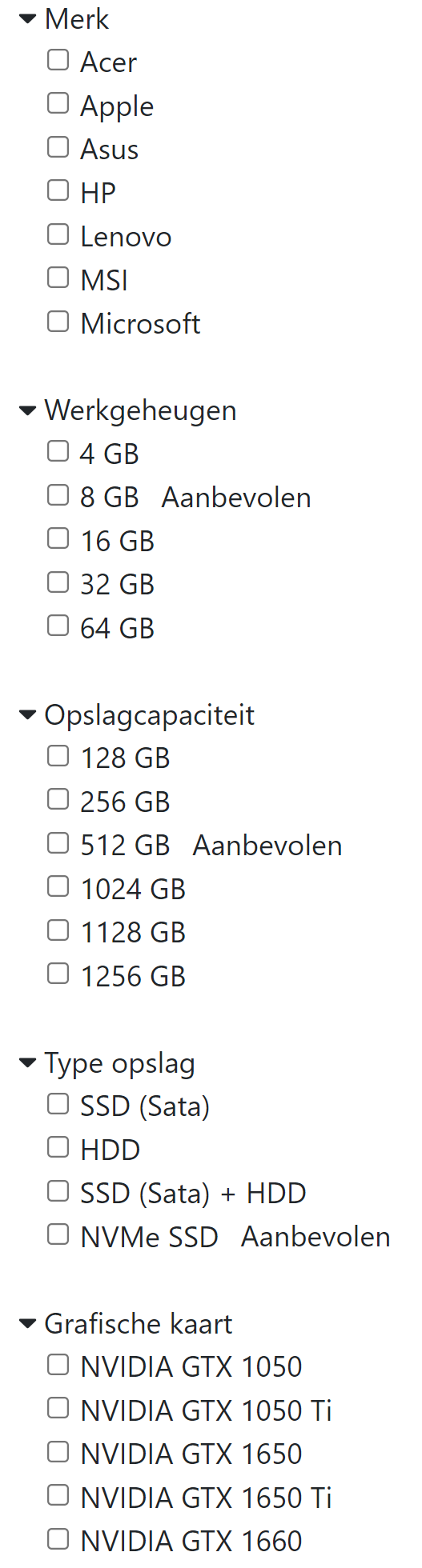 Elke webshop heeft nood aan een manier om de beschikbare objecten te filteren. We beginnen hiermee. Een filter bestaat uit een titel en een aantal opties. Bijvoorbeeld "Merk" wat onderverdeeld is "Acer", "Apple", … De filter kan dichtgeklapt worden, dan zijn de opties niet meer zichtbaar. Dit dichtklappen programmeer je zelf, maak geen gebruikt van bibliotheken of componenten die dit voor jou doen.