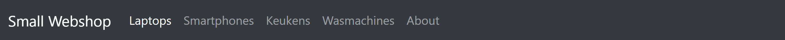 Voeg een navbar toe aan je applicatie. De navbar bevat de links Laptops, Smartphones, Keuken, Wasmachines en About, deze hoeft nog geen werkende links te bevatten.