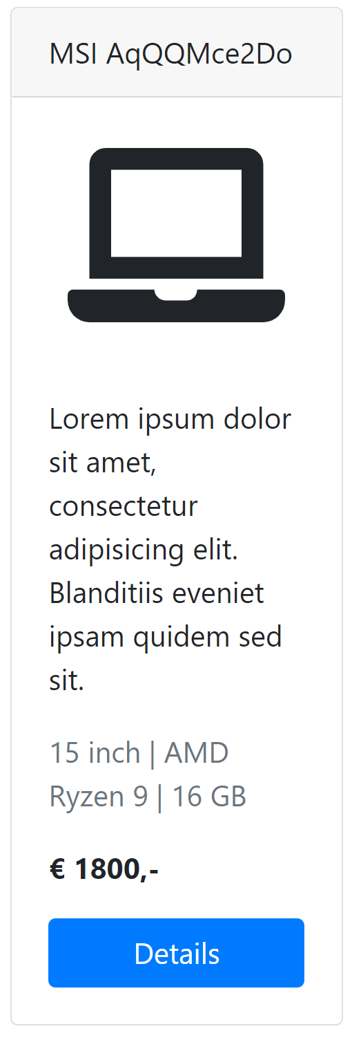 De component ComputerItem heeft één property, computer, en toont informatie over deze computer aan de hand van een Bootstrap Card. Merk op dat de foto voor elke laptop hetzelfde is, namelijk het Font Awesome icoon faLaptop. Om het icoon te stylen kan je onderstaande CSS gebruiken.