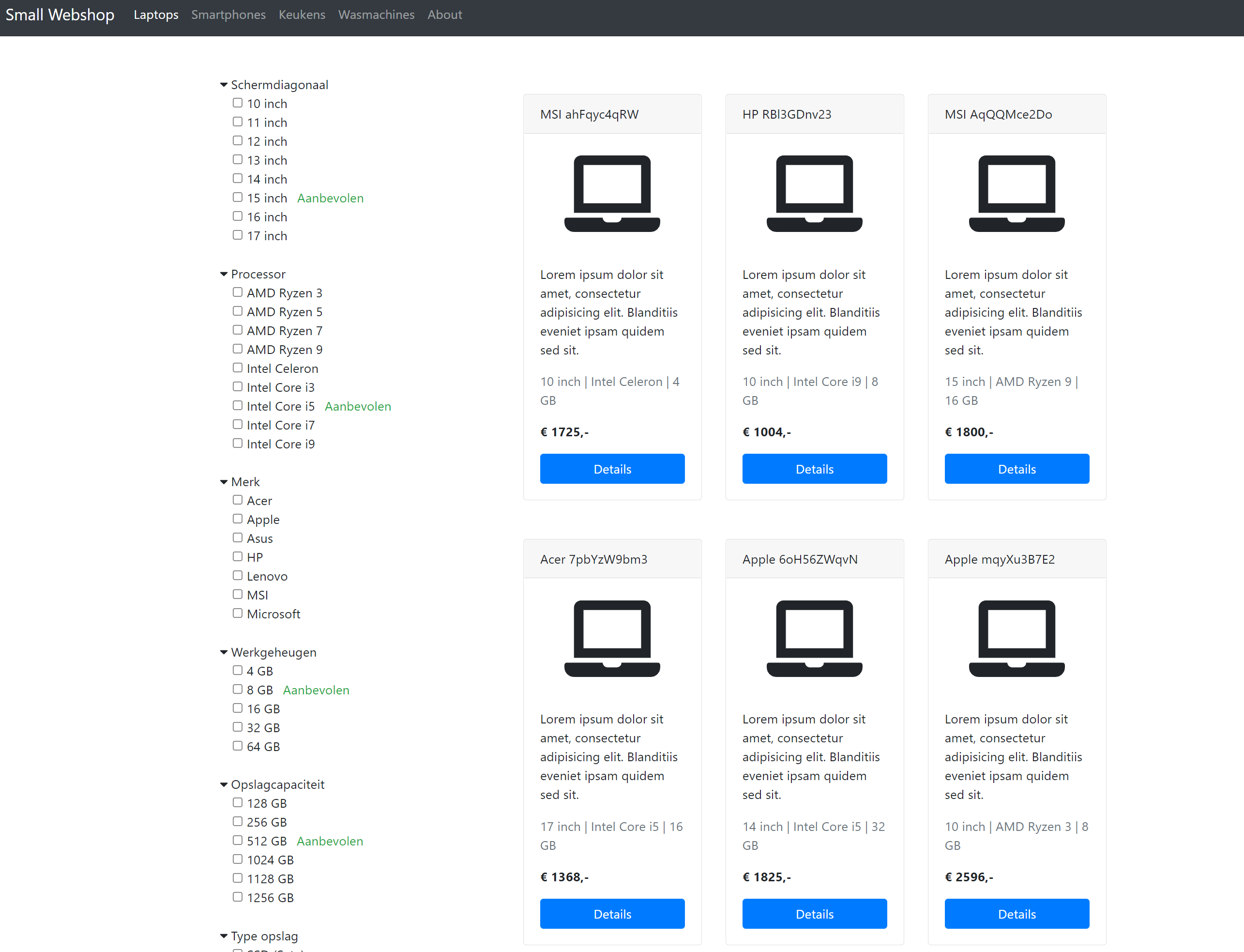 We bouwen een webshop pagina met een aantal laptops, waarvan de specificaties automatisch gegenereerd zijn. De website stelt de gebruiker in staat om de beschikbare laptops te filteren op basis van deze specificaties en om een detailpagina te bekijken.